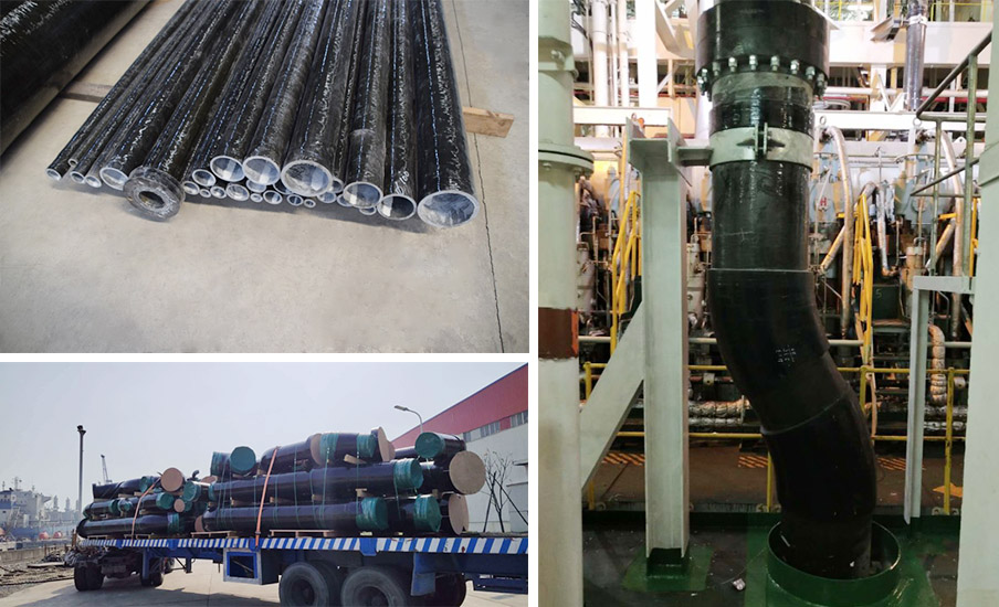公司生產(chǎn)的玻璃鋼管及附件以環(huán)氧樹(shù)脂和連續(xù)玻璃纖維為主要原材料,采用纏繞工藝制造。所有產(chǎn)品的設(shè)計(jì)、放樣、制造及安裝均由我司專(zhuān)業(yè)技術(shù)人員負(fù)責(zé),從原輔材料檢驗(yàn)到工序檢驗(yàn),成品檢驗(yàn),層層嚴(yán)格把關(guān),保證產(chǎn)品質(zhì)量,滿(mǎn)足各大船級(jí)社的規(guī)范要求。玻璃鋼產(chǎn)品目前被廣泛應(yīng)用于船舶機(jī)艙海水系統(tǒng)、壓載系統(tǒng)、艙底水、生活污水、冷卻水等系統(tǒng)。