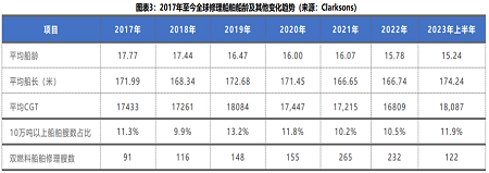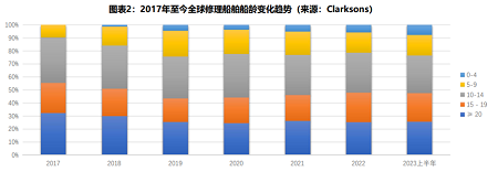 從2017年到2023年,20年及以上船齡的船舶占比由32%下降到25.7%;15-19年船齡的船舶修理由23%下降到22%;10-14年船齡船舶修理由34%下降到29%;而10年以下船齡的船舶修理占比則由10%上升到23%。隨著全球環(huán)保法規(guī)的增加,老舊船舶的淘汰將逐漸增多,修船船齡將持續(xù)呈年輕化趨勢(shì)發(fā)展。從統(tǒng)計(jì)數(shù)據(jù)來(lái)看,全球修船平均船齡已經(jīng)由2017年的17.77年下降到2023年的15.24年。